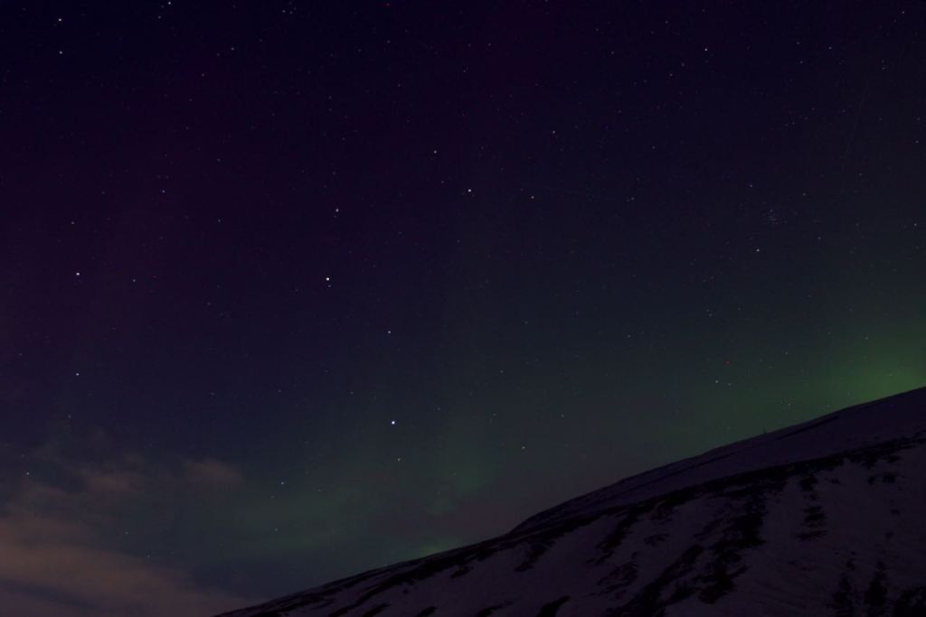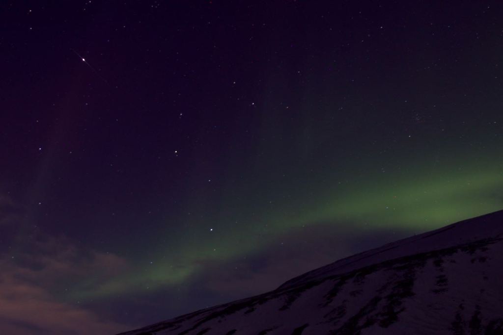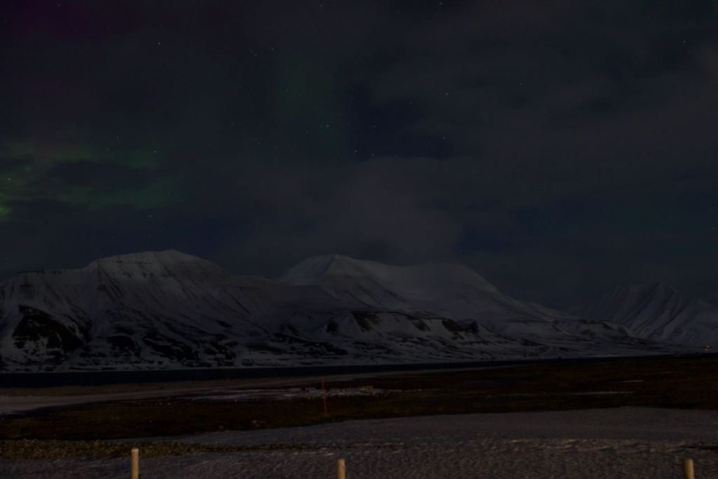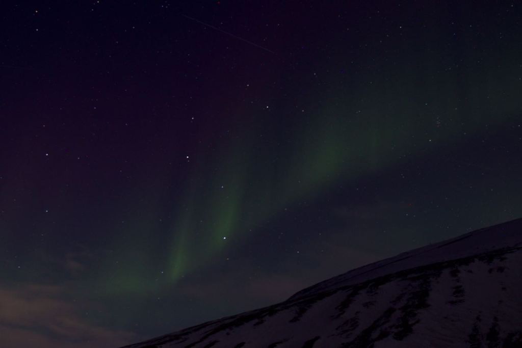 Después de dicho trekking o caminata por toda la zona cercana a Longyearbyen, obteniendo las primeras luces y teniendo la suerte de ver un zorro ártico a lo lejos y un pequeño grupo de perdices nivales. Por la noche decidía intentar por primera vez en las Svalbard probar suerte con la noche y ver si veía una vez más las auroras boreales. Ya las he visto en 4 lugares junto con Svalbard. Groenlandia, Finlandia, Islandia y ahora Svalbard. Y no hizo falta mucho tiempo para obtener un cielo estampado con la magia de la aurora boreal.